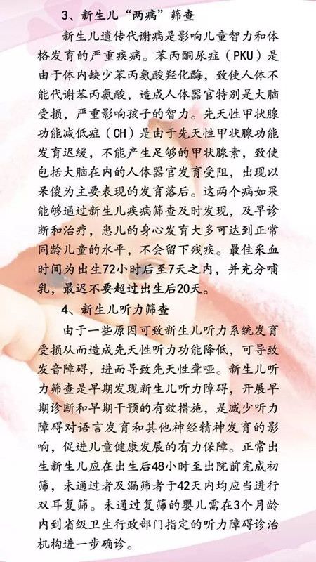 3、新生儿“两病”筛查:最佳采血时间为出生72小时后至7天之内,并充分哺乳,最迟不要超过出生后20天。